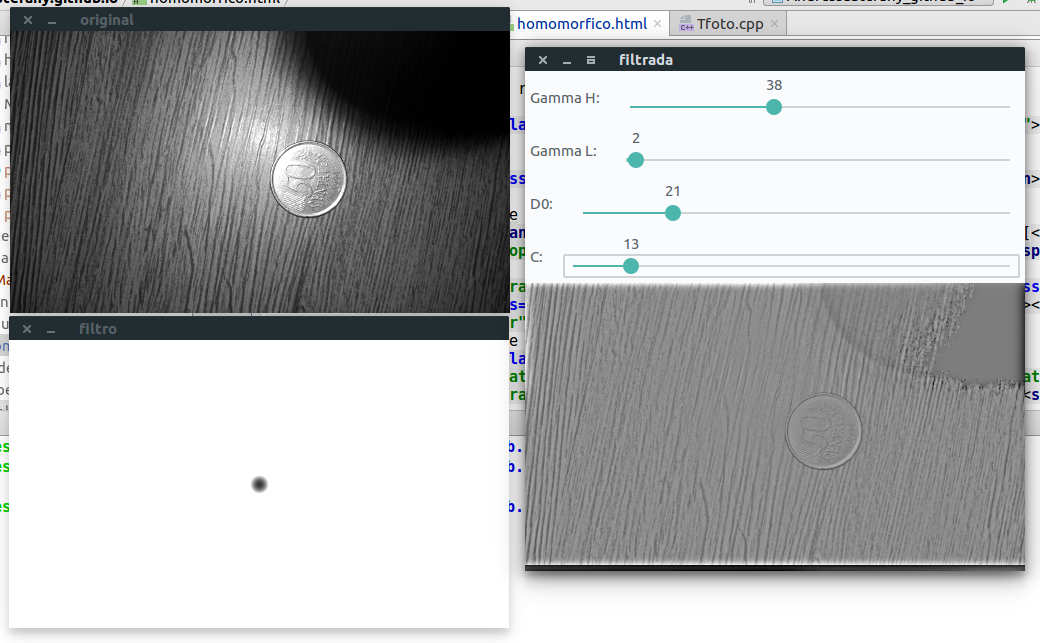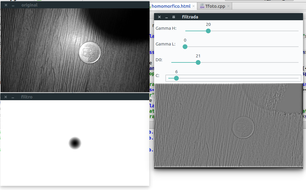 Utilizando o programa exemplos/dft.cpp como referência, implemente o filtro homomórfico para melhorar imagens com iluminação irregular. Crie uma cena mal iluminada e ajuste os parâmetros do filtro homomórfico para corrigir a iluminação da melhor forma possível. Assuma que a imagem fornecida é em tons de cinza.