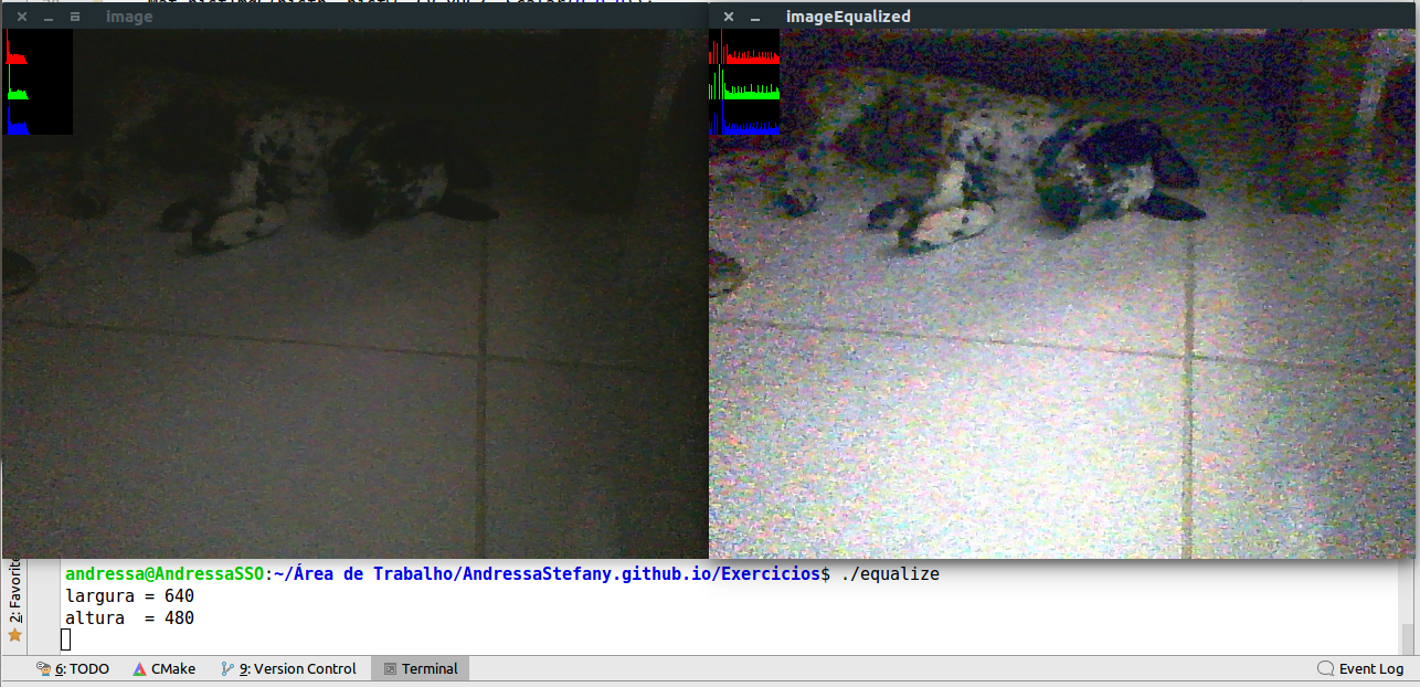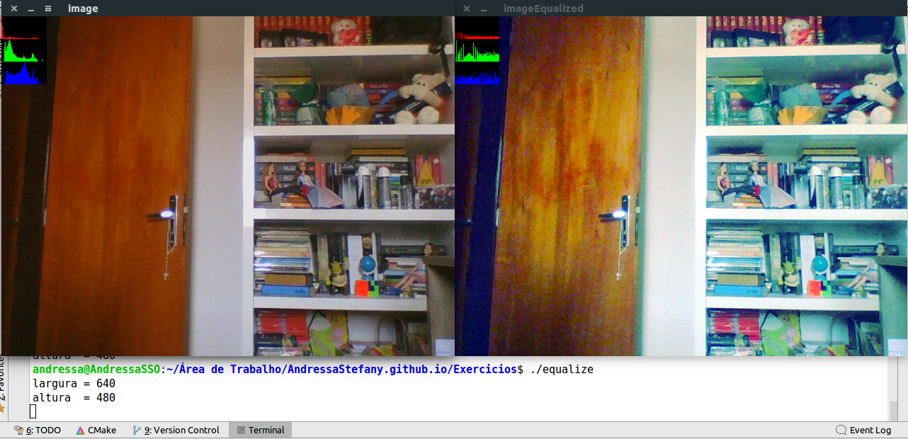 Utilizando o programa exemplos/histogram.cpp como referência, implemente um programa equalize.cpp. Este deverá, para cada imagem capturada, realizar a equalização do histogram antes de exibir a imagem. Teste sua implementação apontando a câmera para ambientes com iluminações variadas e observando o efeito gerado. Assuma que as imagens processadas serão em tons de cinza.