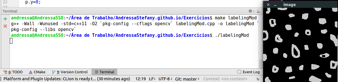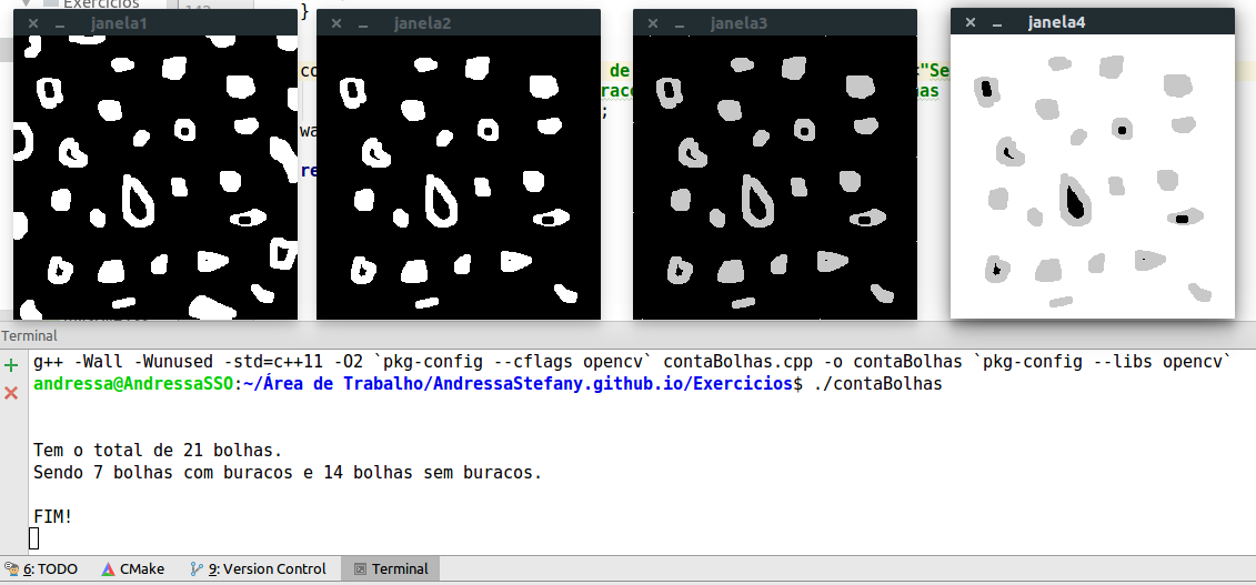 Na imagem abaixo, a "janela1" representa a imagem original, a "janela2" é a imagem após a remoção das bolhas presentes nas bordas, na "janela3" as bolhas foram contadas, por isso não são brancas e, por fim, na "janela4" o fundo foi pintado de uma cor diferente de preto para que fosse possível varrer e identificar quais bolhas possuem buracos, além disso, também há verificação se o buraco encontrado pertence a uma bolha que já foi percorrida antes e contabilizada como bolha com buraco.