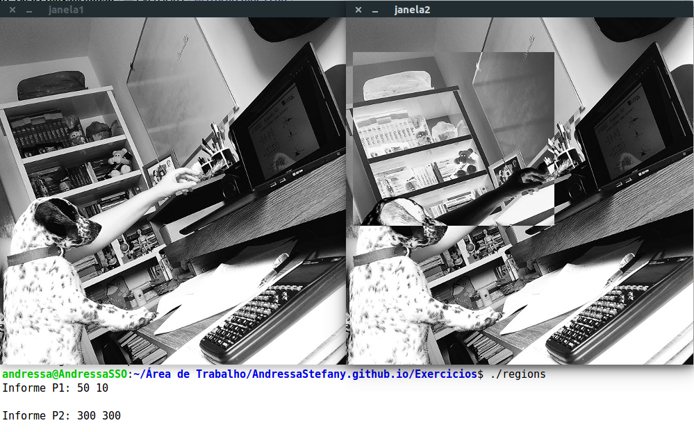 Utilizando o programa exemplos/pixels.cpp como referência, implemente um programa regions.cpp. Esse programa deverá solicitar ao usuário as coordenadas de dois pontos P1P1 e P2P2 localizados dentro dos limites do tamanho da imagem e exibir que lhe for fornecida. Entretanto, a região definida pelo retângulo de vértices opostos definidos pelos pontos P1P1 e P2P2 será exibida com o negativo da imagem na região correspondente.