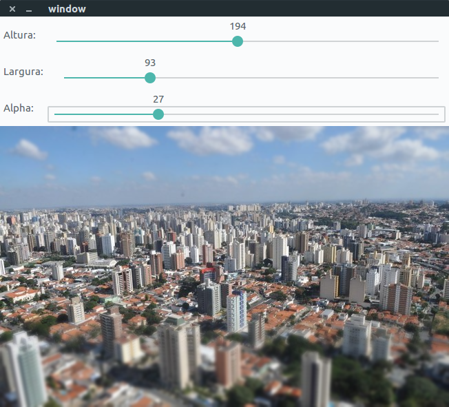 Utilizando o programa exemplos/addweighted.cpp como referência, implemente um programa tiltshift.cpp. Três ajustes deverão ser providos na tela da interface: